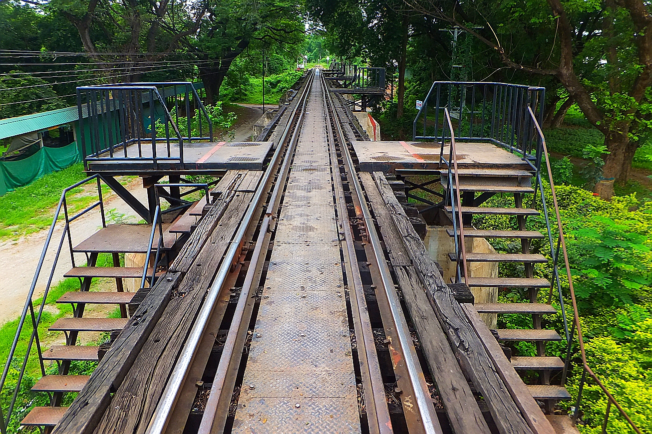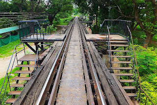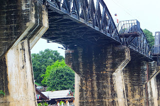 A trip I made last year but didn't get off at the bridge since I  wanted that iconic experience of riding a train right across it. This time, getting off after the 3 hour trip is a relief since the seats are clearly not designed for western butts! Its a small place but developing and easy to see why - tourists by the hundred falling in behind the train as it rumbles at a snails pace over the River Kwai Bridge. About 3 hours before it returns, miss it and its a night here until same time tomorrow. So, now I'm here lets join in and walk the walk across that WW2 icon over the River Kwai. 100 Baht to get here, another 100 Baht to return to Bangkok - exactly the same as Twelve months ago!
